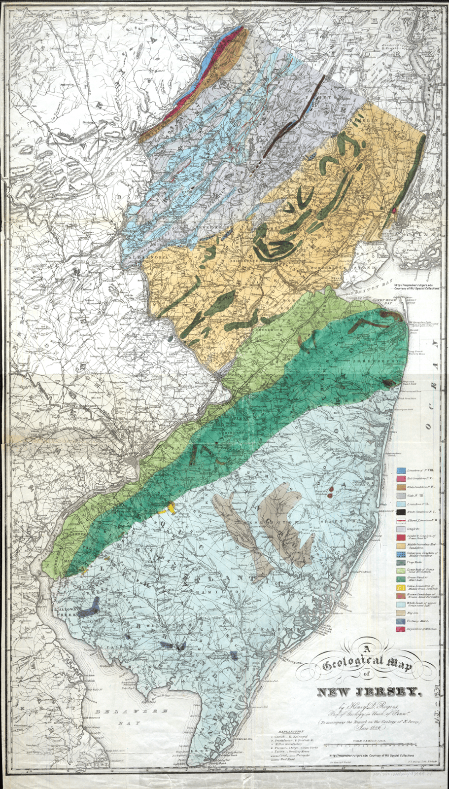 Rogers, Henry D. (1839).A Geological Map of New Jersey to accompany the Report on the Geology of N.Jersey Jan 1839. https://geography.rutgers.edu/historical-maps-of-new-jersey. Retrieved Nov 2023.